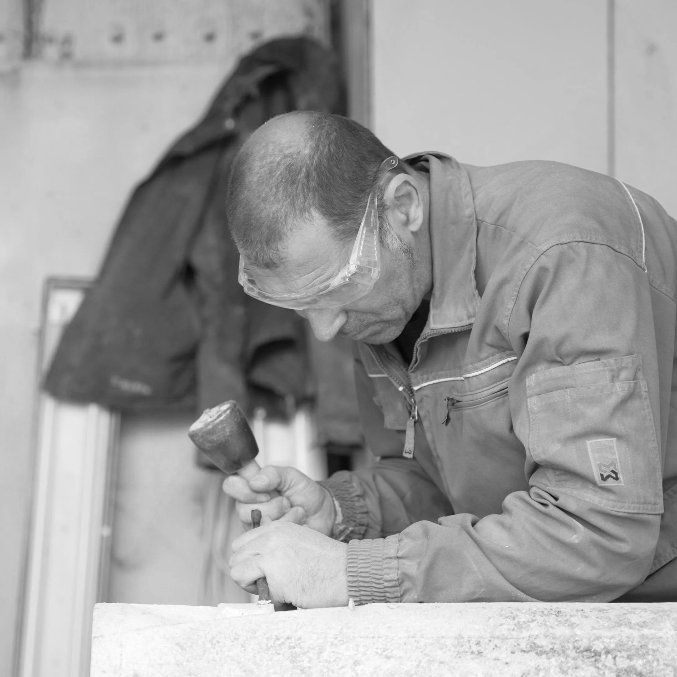 Alonso Gómez posee un experto conocimiento de las técnicas de cantería tradicional que viene avalado por la larga historia de su familia en el oficio, representando a la quinta generación de canteros. Muy ligados a la provincia de Cáceres, sus antepasados trabajaron en la construcción y restauración de edificios ilustres como El Palacio de los Golfines o el Palacio de los Marqueses de Torreorgaz.